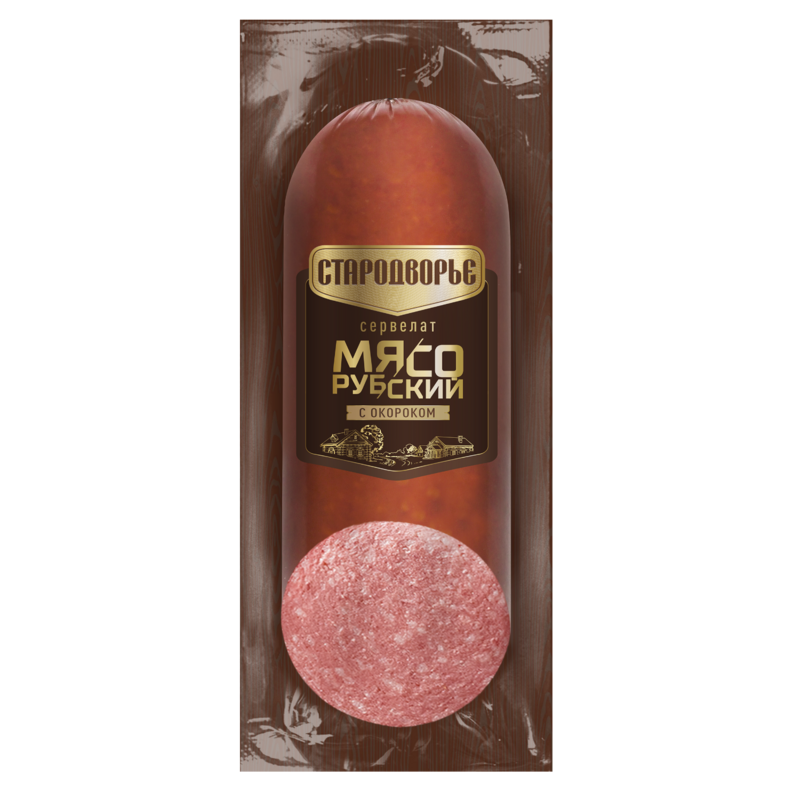 По-настоящему вкусный сервелат, приготовленный по деревенскому рецепту из мелкорубленого окорока с добавлением ароматных пряностей. Томленый в печи для сочности и вкуса.